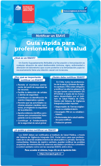 Para realizar reportes de casos de ESAVI, deberá utilizar el Sistema de Vigilancia Integrada ESAVI. Portal único para que profesionales de la salud de establecimientos de salud público y privado, farmacias comunitarias, titulares de registro sanitario, puedan notificar las posibles sospechas de eventos/efectos adversos asociados a productos sometidos a control sanitario como son las vacunas (ESAVI), entre otros.