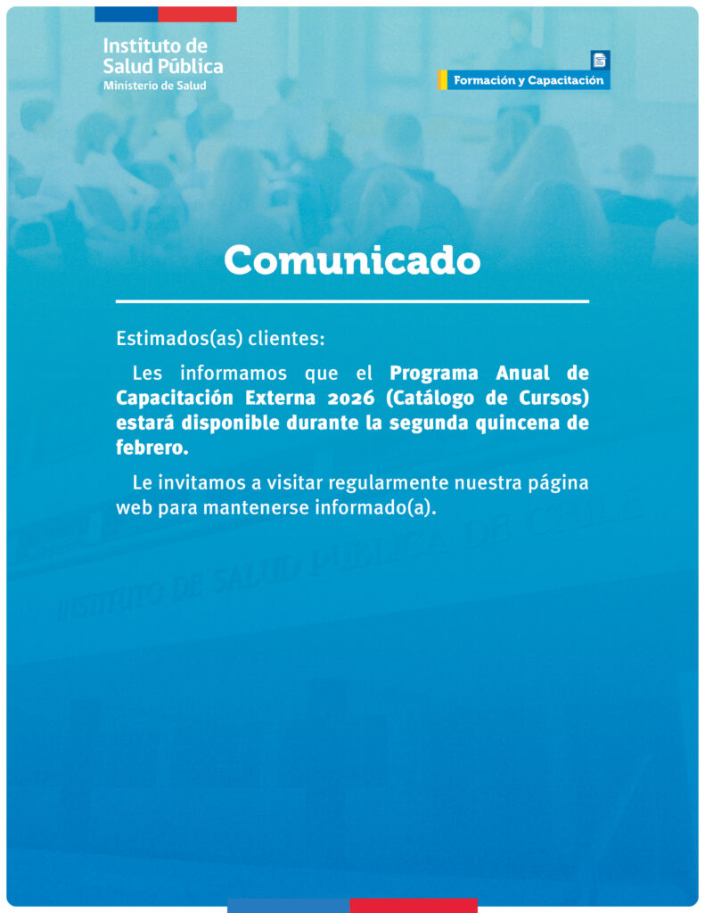El Instituto de Salud Pública de Chile con la finalidad de promover y proteger la salud de la población, desarrolla actividades de capacitación impartidas en modalidad presencial y/o virtual dirigida principalmente a instituciones u organizaciones, contribuyendo así en aumentar el nivel de conocimientos, habilidades y actitudes en las personas que laboran en el sector público o privado otorgando de esta manera cobertura a las necesidades formativas y de transferencia tecnológica vinculadas al sector de la salud.