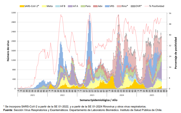 La distribución acumulada hasta la SE 44 del 2025, es: Rinovirus (30,7%), Influenza A (20,9%), Virus Respiratorio Sincicial (VRS) (15,6%), Parainfluenza (8,4%), Adenovirus (Adv) (6,4%), Metapneumovirus (6,3%), SARS-CoV-2 (5,3%), OVR (4,5%) e Influenza B (1,9%).