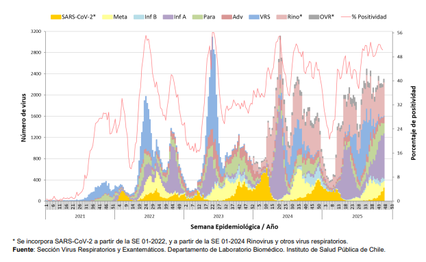 La distribución acumulada hasta la SE 47 del 2025, es: Rinovirus (30,3%), Influenza A (22,3%), Virus Respiratorio Sincicial (VRS) (14,3%), Parainfluenza (8,5%), Metapneumovirus (6,4%), Adenovirus (Adv) (6,2%), SARS-CoV-2 (5,7%), OVR (4,3%) e Influenza B (2,0%).
