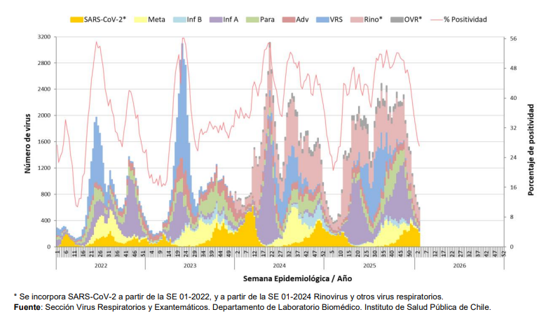 En relación a SARS-CoV-2, en el mes de diciembre 2025, existió una preponderancia de la circulación de XFG* (n=316), correspondiente al 99,4% de los casos secuenciados en el periodo. La distribución acumulada hasta la SE 04 del 2026, es: SARS-CoV-2 (38,3%), Rinovirus (30,4%), Adenovirus (Adv) (9,3%), Influenza A (7,6%), Parainfluenza (6,5%), OVR (3,7%), Metapneumovirus (2,9%), Virus Respiratorio Sincicial (VRS) (0,7%) e Influenza B (0,6%).