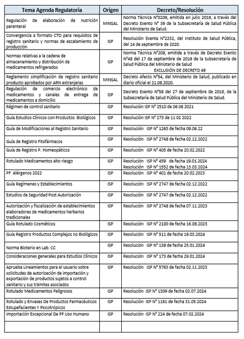 El Ministerio de Salud también emitió la Resolución Exenta N°668, del 02 de octubre de 2015, que “Constituye Grupo de Trabajo para la Coordinación de las Actividades de Regulación en Medicamentos, Elementos de Uso Médico y Cosméticos” (GTCR) que aporta principios y flujos para iniciativas de ley, reglamentos, normas técnicas y administrativas, actualizada por la Resolución Exenta N°456, del 10 de marzo de 2022.