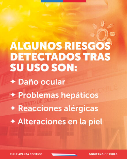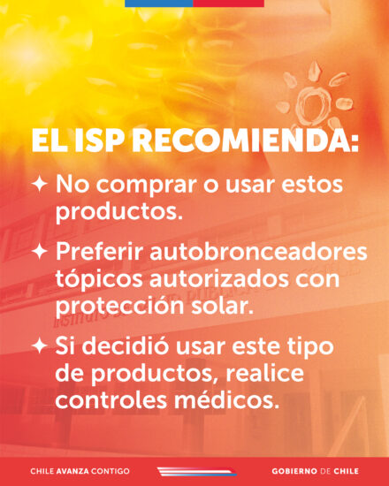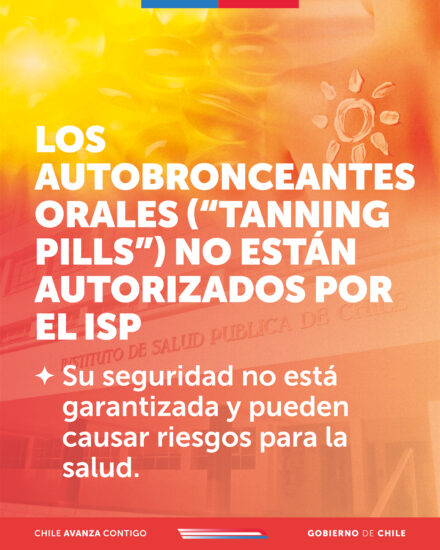 El Instituto de Salud Pública informa que ha detectado la comercialización en territorio nacional de productos autobronceantes de uso oral, también conocidos como “tanning pills” o “pastillas bronceadoras”, los cuales no cuentan con autorización sanitaria, ante lo cual se insta a las personas a no utilizarlos.