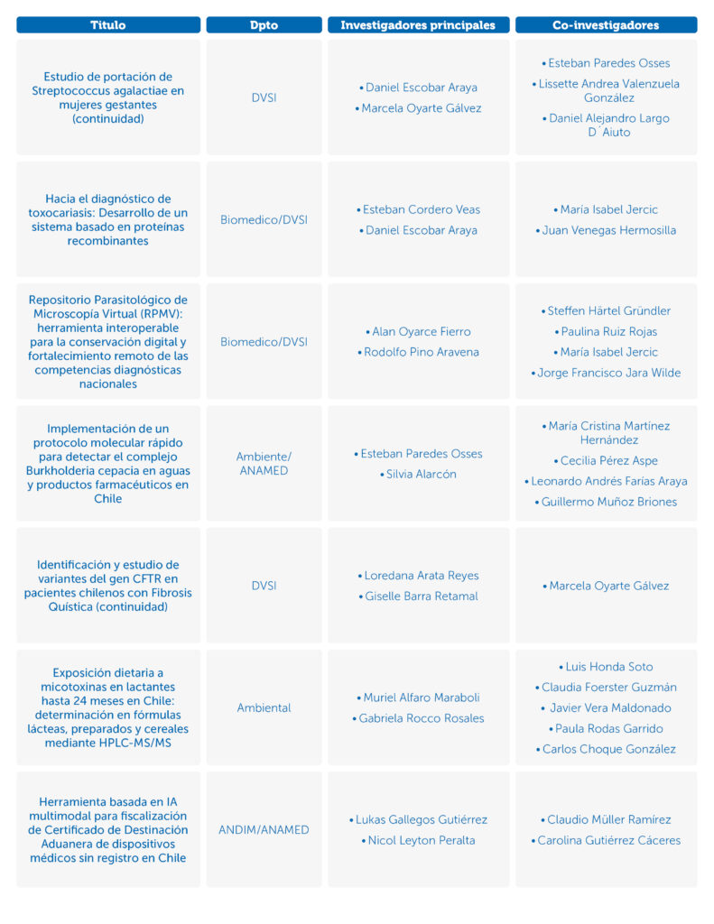 Luego de cumplir con los criterios de admisibilidad, se seleccionaron los que tenían mayor puntaje dependiendo de la línea temática, siempre que no superaran el monto máximo de $80.000.000 (incluyendo el IVA). Los proyectos tendrán hasta 24 meses para ejecutarse y entregar sus resultados, que se esperan contribuyan tanto como con publicaciones en revistas científicas indexadas, divulgación y el desarrollo/aplicación de tecnologías que fortalezcan la salud pública.
