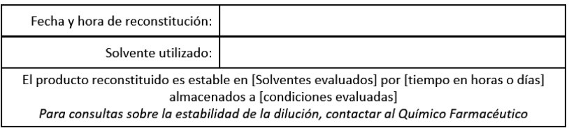 Para productos o preparaciones que requieran de reconstitución y/o dilución previa a su administración, se deberá incluir en el rotulado gráfico del envase secundario y en el envase primario, cuando su tamaño lo permita, las siguientes frases, según sea el caso: