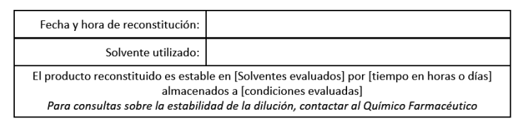 Para productos o preparaciones que requieran de reconstitución y/o dilución previa a su administración, se deberá incluir en el rotulado gráfico del envase secundario y en el envase primario, cuando su tamaño lo permita, las siguientes frases, según sea el caso: